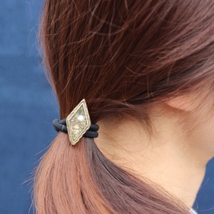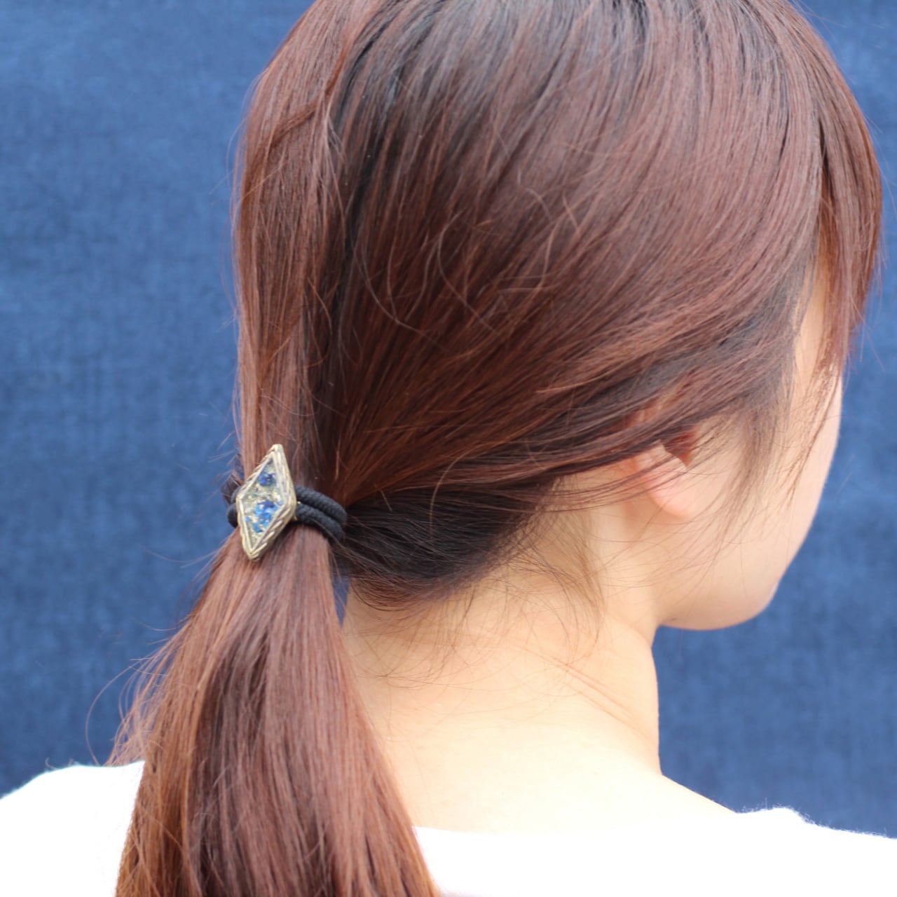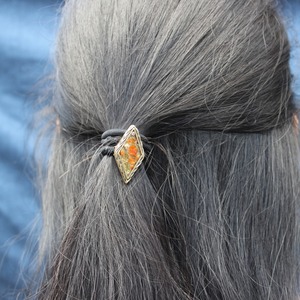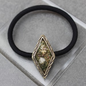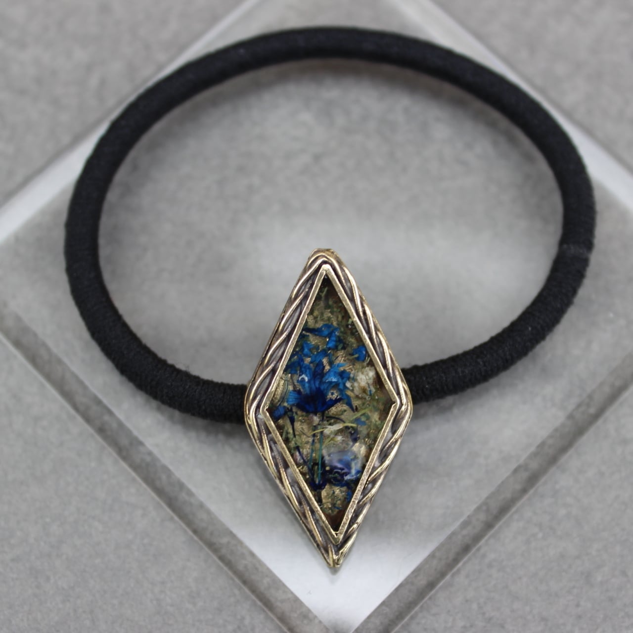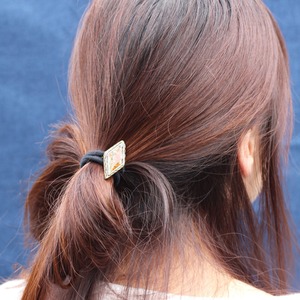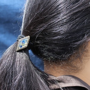 実際の花カスミソウを使い、染色し押し花にした後,レジン(樹脂)に閉じ込めたヘアゴム