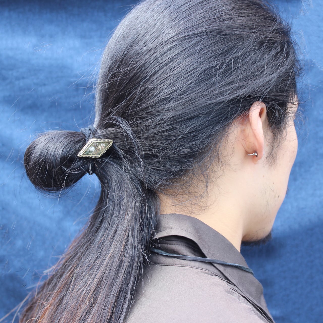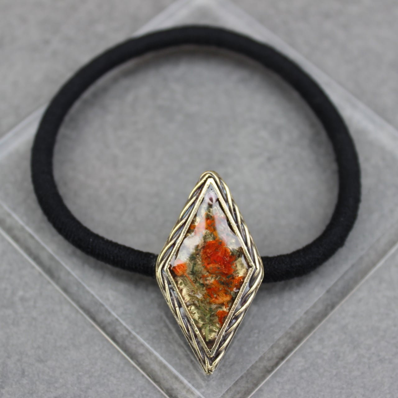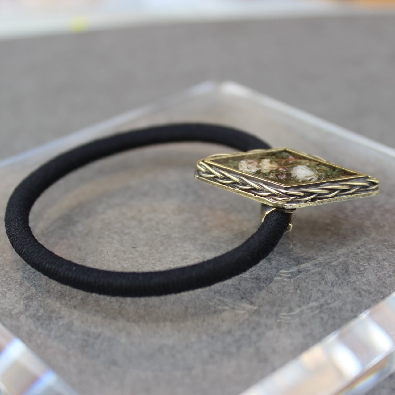実際の花カスミソウを使い、染色し押し花にした後,レジン(樹脂)に閉じ込めたヘアゴム
